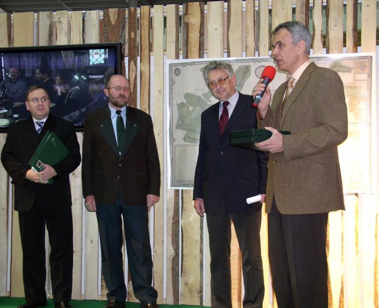 Předání plakety "České lesnictví ve světě" Prof. Ročkovi, Zleva: Miroslav Prokop, Ing. Jaromír Nikl, Ivan Roček, CSc. a Jaromír Vašíček; Foto: Karel Vančura